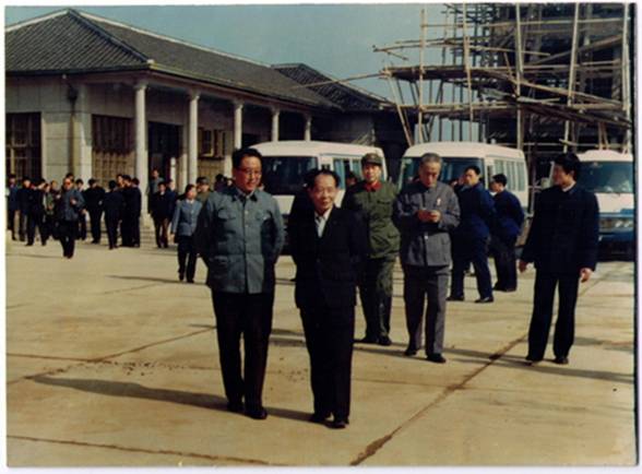 2、1991年3月國(guó)務(wù)院三線調(diào)遷辦主任魯大東(右1)在江西省副省長(zhǎng)錢(qián)家銘,長(zhǎng)林機(jī)械廠副廠長(zhǎng)胡孟理的陪同下視察新余新廠建設(shè)