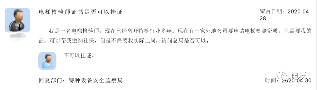 問:電梯檢驗師證書是否可以掛證 我是一名電梯檢驗師,現在已經離開特檢行業多年?,F在有一家外地公司要申請電梯檢測資質,只需要我的證,可以幫我繳納社保,但是不需要我實際上崗,請問總局是否可以。 總局回復:不可以掛證。