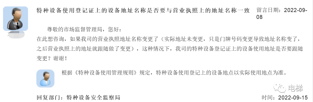 問:特種設備使用登記證上的設備地址名稱是否要與營業(yè)執(zhí)照上的地址名稱一致 尊敬的市場監(jiān)督管理局,您好: 總局回復:根據(jù)《特種設備使用管理規(guī)則》規(guī)定,特種設備使用登記上的設備地點以實際使用地點為準。