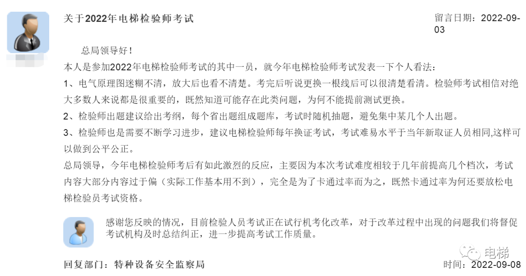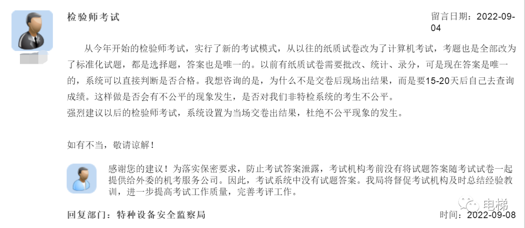 問:關(guān)于2022年電梯檢驗師考試 總局領導好! 總局回復:感謝您反映的情況,目前檢驗人員考試正在試行機考化改革,對于改革過程中出現(xiàn)的問題我們將督促考試機構(gòu)及時總結(jié)糾正,進一步提高考試工作質(zhì)量。