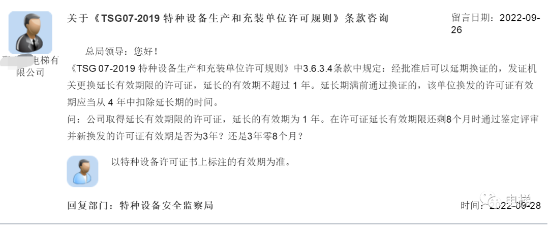 問:關(guān)于《TSG07-2019 特種設備生產(chǎn)和充裝單位許可規(guī)則》條款咨詢 總局領導:您好! 總局回復:以特種設備許可證書上標注的有效期為準。