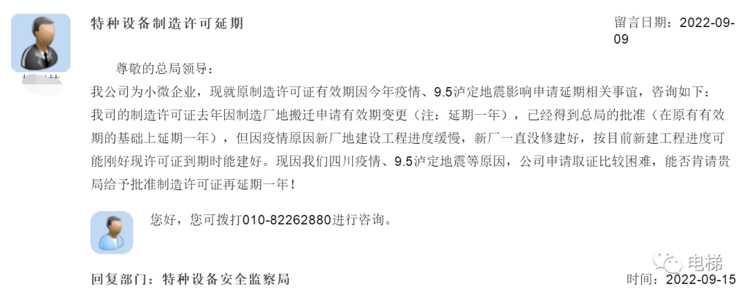 問:特種設備制造許可延期 尊敬的總局領導: 總局回復:您好,您可撥打010-82262880進行咨詢。