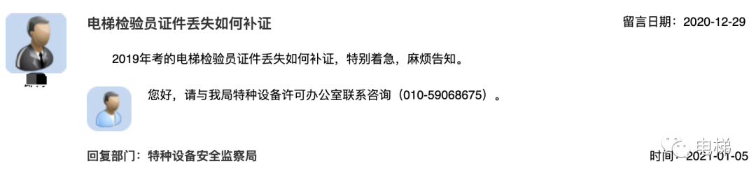 05 問:電梯檢驗員證件丟失如何補證 2019年考的電梯檢驗員證件丟失如何補證,特別著急,麻煩告知。 總局回復:您好,請與我局特種設備許可辦公室聯系咨詢(010-59068675)