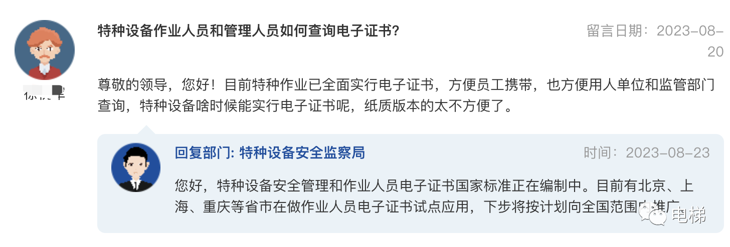 問:特種設備作業(yè)人員和管理人員如何查詢電子證書?尊敬的領導,您好!目前特種作業(yè)已全面實行電子證書,方便員工攜帶,也方便用人單位和監(jiān)管部門查詢,特種設備啥時候能實行電子證書呢,紙質版本的太不方便了。 總局回復:您好,特種設備安全管理和作業(yè)人員電子證書國家標準正在編制中。目前有北京、上海、重慶等省市在做作業(yè)人員電子證書試點應用,下步將按計劃向全國范圍內推廣。