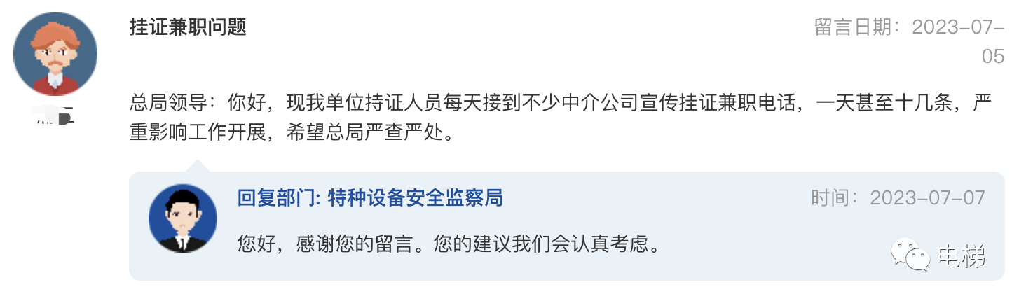 問:掛證兼職問題 總局領導:你好,現(xiàn)我單位持證人員每天接到不少中介公司宣傳掛證兼職電話,一天甚至十幾條,嚴重影響工作開展,希望總局嚴查嚴處。 總局回復:您好,感謝您的留言。您的建議我們會認真考慮