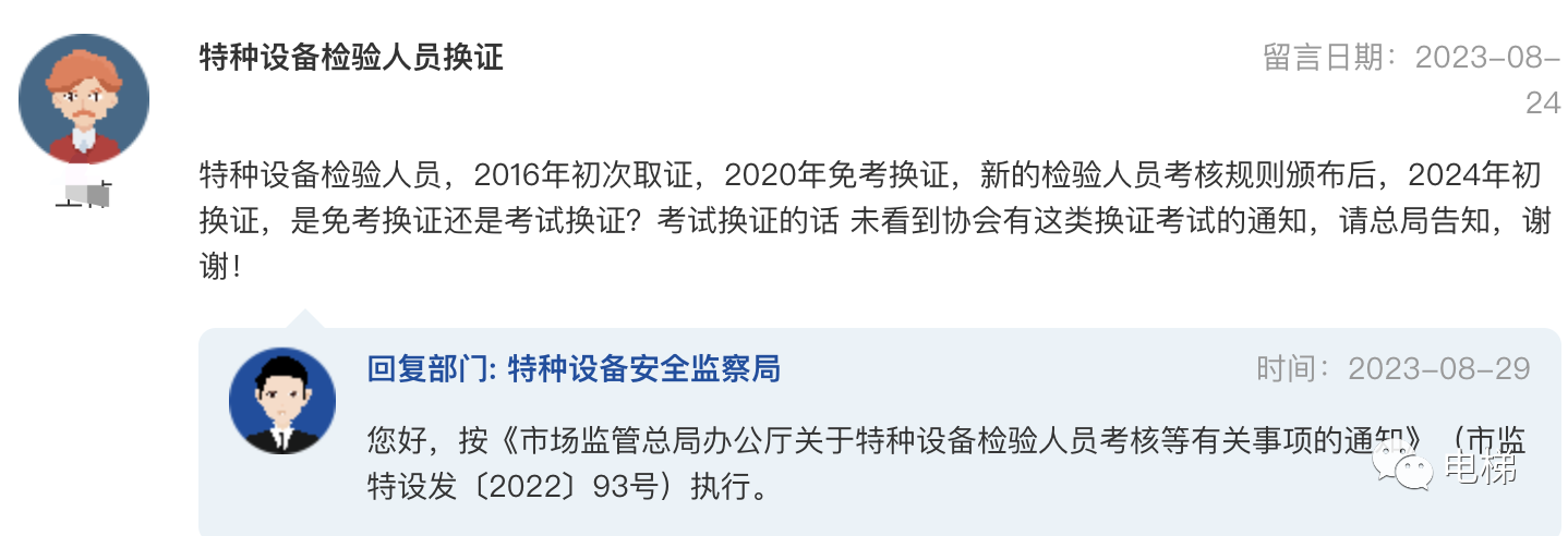問:特種設備檢驗人員換證 特種設備檢驗人員,2016年初次取證,2020年免考換證,新的檢驗人員考核規(guī)則頒布后,2024年初換證,是免考換證還是考試換證?考試換證的話 未看到協(xié)會有這類換證考試的通知,請總局告知,謝謝! 總局回復:您好,按《市場監(jiān)管總局辦公廳關于特種設備檢驗人員考核等有關事項的通知》(市監(jiān)特設發(fā)〔2022〕93號)執(zhí)行。