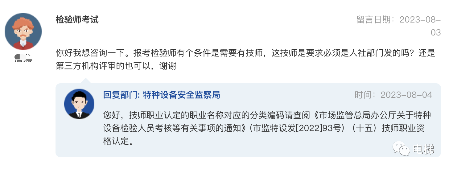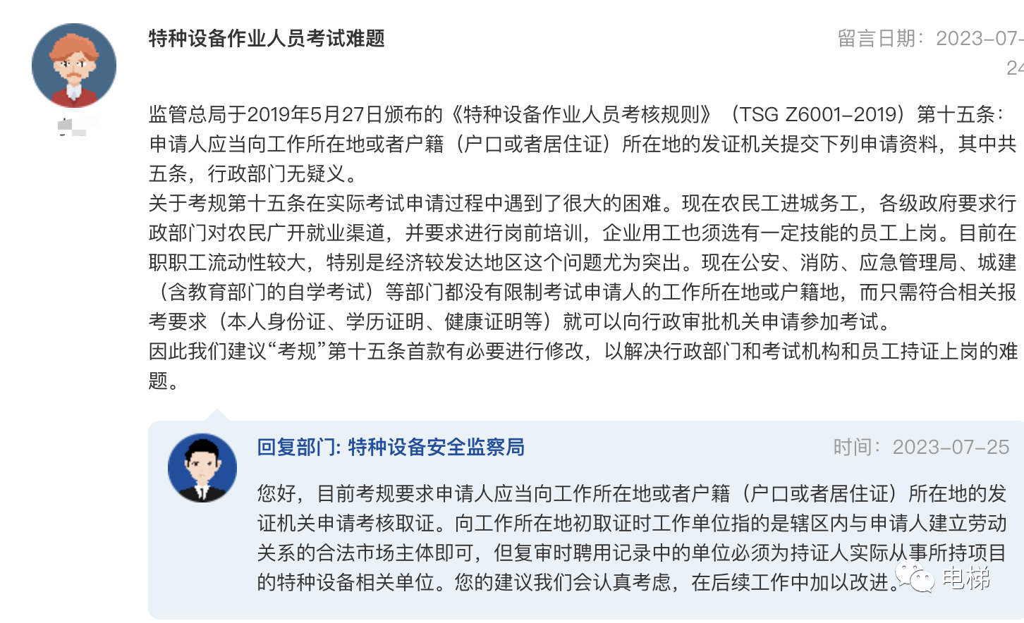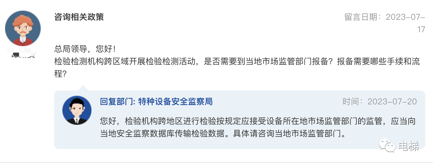 問題:特種設備作業(yè)人員考試難題 監(jiān)管總局于2019年5月27日頒布的《特種設備作業(yè)人員考核規(guī)則》(TSG Z6001-2019)第十五條:申請人應當向工作所在地或者戶籍(戶口或者居住證)所在地的發(fā)證機關提交下列申請資料,其中共五條,行政部門無疑義。關于考規(guī)第十五條在實際考試申請過程中遇到了很大的困難。現(xiàn)在農(nóng)民工進城務工,各級政府要求行政部門對農(nóng)民廣開就業(yè)渠道,并要求進行崗前培訓,企業(yè)用工也須選有一定技能的員工上崗。目前在職職工流動性較大,特別是經(jīng)濟較發(fā)達地區(qū)這個問題尤為突出。現(xiàn)在公安、消防、應急管理局、城建(含教育部門的自學考試)等部門都沒有限制考試申請人的工作所在地或戶籍地,而只需符合相關報考要求(本人身份證、學歷證明、健康證明等)就可以向行政審批機關申請參加考試。因此我們建議“考規(guī)”第十五條首款有必要進行修改,以解決行政部門和考試機構和員工持證上崗的難題。 總局回復:您好,目前考規(guī)要求申請人應當向工作所在地或者戶籍(戶口或者居住證)所在地的發(fā)證機關申請考核取證。向工作所在地初取證時工作單位指的是轄區(qū)內與申請人建立勞動關系的合法市場主體即可,但復審時聘用記錄中的單位必須為持證人實際從事所持項目的特種設備相關單位。您的建議我們會認真考慮,在后續(xù)工作中加以改進。 ![]() 問:咨詢相關政策 總局領導,您好! 總局回復:您好,檢驗機構跨地區(qū)進行檢驗按規(guī)定應接受設備所在地市場監(jiān)管部門的監(jiān)管,應當向當?shù)匕踩O(jiān)察數(shù)據(jù)庫傳輸檢驗數(shù)據(jù)。具體請咨詢當?shù)厥袌霰O(jiān)管部門。