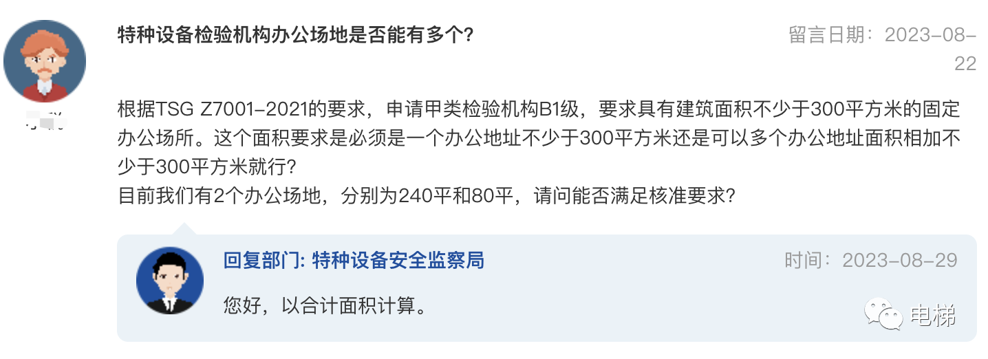 問:特種設備檢驗機構辦公場地是否能有多個? 根據(jù)TSG Z7001-2021的要求,申請甲類檢驗機構B1級,要求具有建筑面積不少于300平方米的固定辦公場所。這個面積要求是必須是一個辦公地址不少于300平方米還是可以多個辦公地址面積相加不少于300平方米就行? 總局回復:您好,以合計面積計算。