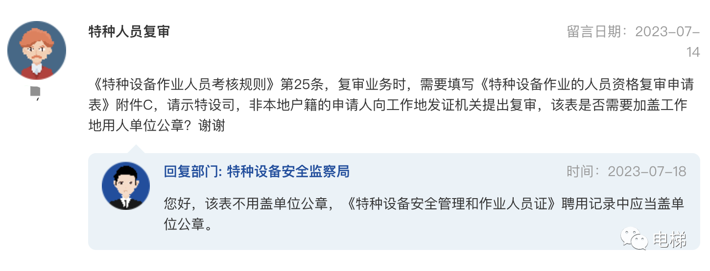 問:特種人員復審 《特種設備作業(yè)人員考核規(guī)則》第25條,復審業(yè)務時,需要填寫《特種設備作業(yè)的人員資格復審申請表》附件C,請示特設司,非本地戶籍的申請人向工作地發(fā)證機關提出復審,該表是否需要加蓋工作地用人單位公章?謝謝 總局回復:您好,該表不用蓋單位公章,《特種設備安全管理和作業(yè)人員證》聘用記錄中應當蓋單位公章