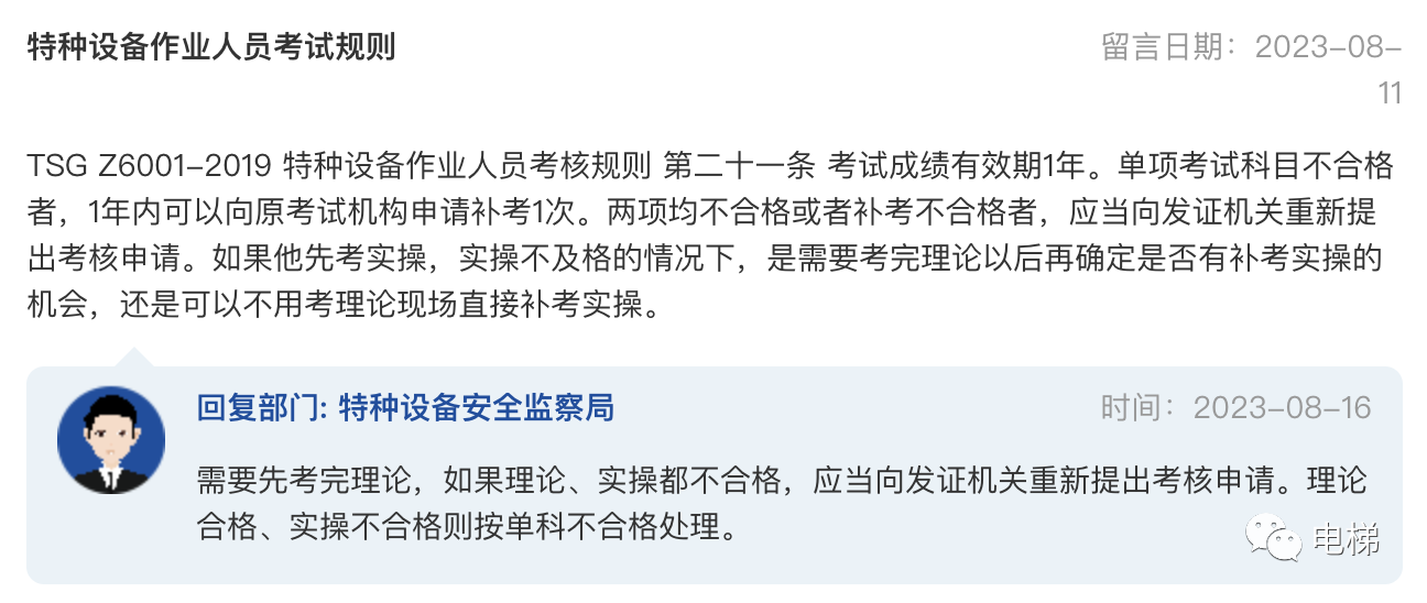 問:特種設備作業(yè)人員考試規(guī)則TSG Z6001-2019 特種設備作業(yè)人員考核規(guī)則 第二十一條 考試成績有效期1年。單項考試科目不合格者,1年內可以向原考試機構申請補考1次。兩項均不合格或者補考不合格者,應當向發(fā)證機關重新提出考核申請。如果他先考實操,實操不及格的情況下,是需要考完理論以后再確定是否有補考實操的機會,還是可以不用考理論現(xiàn)場直接補考實操。 總局回復:需要先考完理論,如果理論、實操都不合格,應當向發(fā)證機關重新提出考核申請。理論合格、實操不合格則按單科不合格處理。