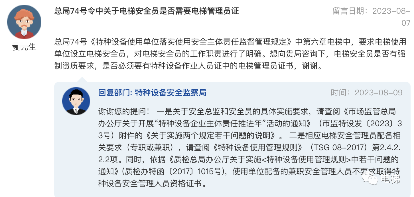 問:總局74號令中關于電梯安全員是否需要電梯管理員證 總局74號《特種設備使用單位落實使用安全主體責任監(jiān)督管理規(guī)定》中第六章電梯中,要求電梯使用單位設立電梯安全員,對電梯安全員的工作職責進行了明確。想向貴局咨詢下,電梯安全員是否有強制資質要求,是否必須要有特種設備作業(yè)人員證中的電梯管理員證書,謝謝。 總局回復:謝謝您的提問!一是關于安全總監(jiān)和安全員的具體實施要求,請查閱《市場監(jiān)管總局辦公廳關于開展“特種設備企業(yè)主體責任推進年”活動的通知》(市監(jiān)特設發(fā)〔2023〕33號)附件的《關于實施兩個規(guī)定若干問題的說明》。二是相應電梯安全管理員配備相關要求(專職或兼職),請查閱《特種設備使用管理規(guī)則》(TSG 08-2017)第2.4.2.2.2項。同時,依據(jù)《質檢總局辦公廳關于實施<特種設備使用管理規(guī)則>中若干問題的通知》(質檢辦特函〔2017〕1015號),使用單位配備的兼職安全管理人員不要求取得特種設備安全管理人員資格證書。 ![]() 總局領導好: 總局回復:您好,涉及行政處罰問題,請按照省級市場監(jiān)管要求執(zhí)行,如有不同意見,請依程序請示辦理。
