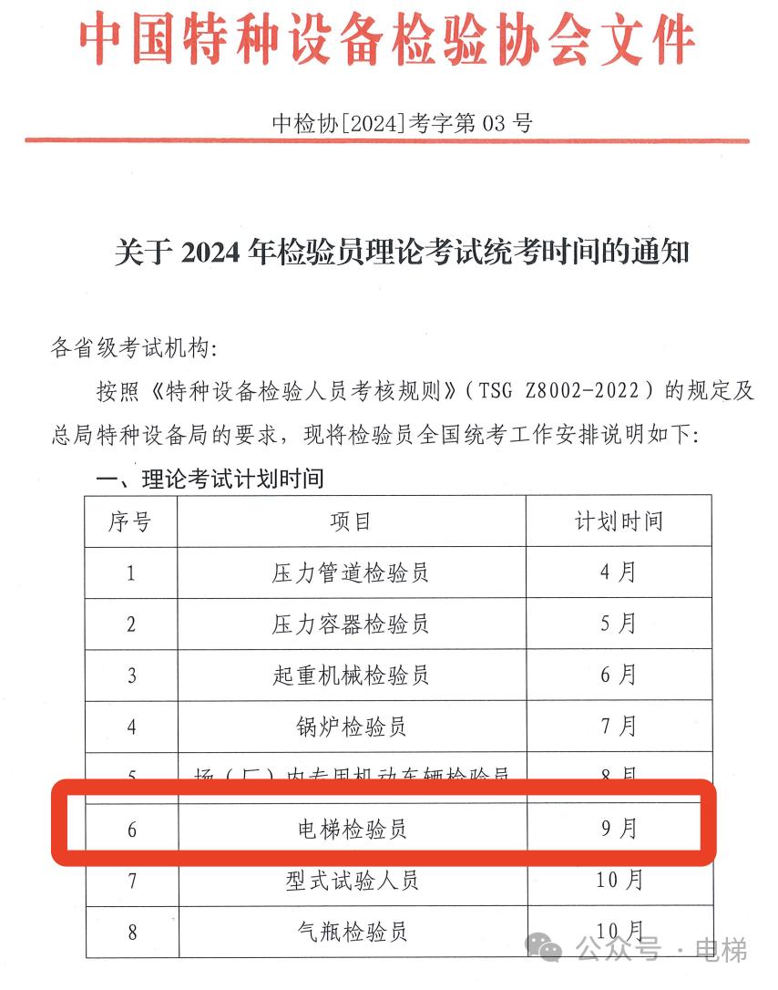 2024年1月10日中國特種設備檢驗協會發布了今年電梯檢驗員統考計劃,全國電梯檢驗員理論統一考試的時間安排在9月份。